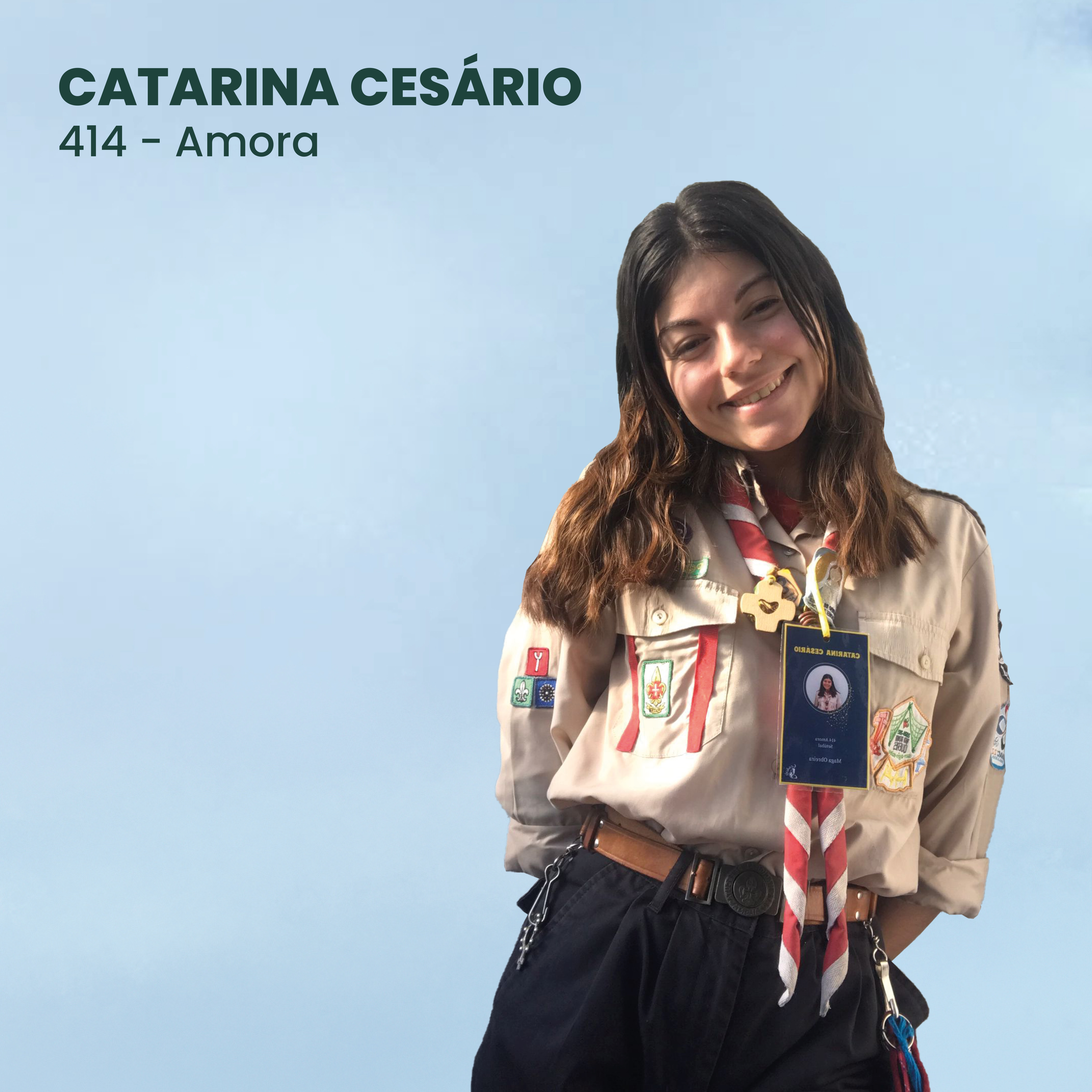 Chamo-me Catarina mais conhecida pelo meu apelido, Cesário e sou a vossa embaixadora durante este ciclo ehehe!! Entrei nos escuteiros em 2014 no Agrupamento 253 Seixal porém, percebi que apesar de todos os ensinamentos que aprendera, a vida marítima não era para mim encontrando-me atualmente no 414 Amora, Região de Setúbal.